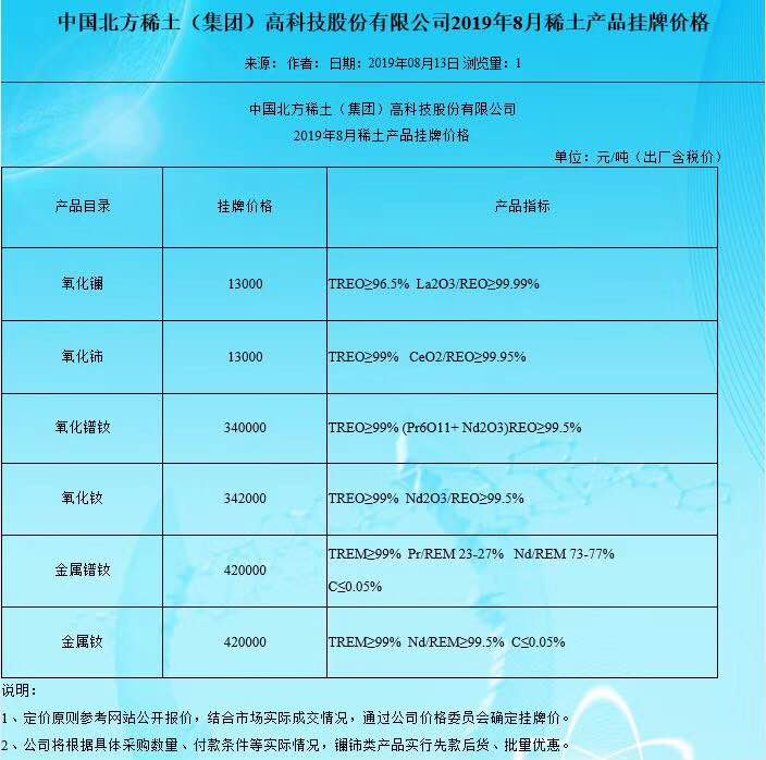 北方稀土2019年8月稀土产品挂牌价